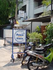 プロームポン駅を降りてSoi39に入ってしばらく歩くと右に入ったところに「ピース・ストア」がある。店内ではお香の香りに包まれていて、ファッション雑貨やオリジナルの箸など、他店にないセンスの良いアイテムが見つかる店だ。特に「ピース・ストア」のオリジナルデザインバッグはオススメ。どんなに時間をかけて買っても「あれも買ってくればよかった。」と思い残すほど。シルクのバッグはきれいな色をしており、バックスキンはよく使われる革よりも汚れにくいそうだ。他にも夏に大活躍するかごのバッグなど。かごバックはすごく柔らかいし、見た目以上に物が入るから重宝する。ガラスのアクセサリーもたくさん販売している。消臭剤もゾウの形をした可愛らしいものだったりして、いちいち心惹かれる商品の数々。「ピース・ストア」で必ず購入するオススメの商品はパシュミナとシルクのストールだ。色の種類が豊富なのと、色見がすごく綺麗なのだ。「ピース・ストア」は日本人の方が経営しているようで、いつも店内にいる。そのため言葉の壁もなく買い物しやすい。店内は適度な広さで、センスの良い商品の並べ方で手にとって見やすいため、ついつい買ってしまう。アジアン雑貨を買うなら「ピース・ストア」がイチオシ。きっとお気に入りのものが見つかるだろう。