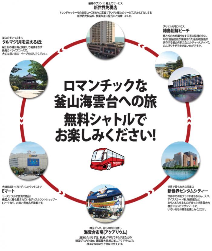 *無料シャトルバス運行中! 新世界免税店から、釜山ロッテホテル、釜山国際ホテルなど釜山市内のホテルを回る2路線、 Eマート、海雲台市場、新世界センタムシティを回る1路線の計3路線の無料シャトルバスが毎日運行中! 新世界免税店を利用する外国人は、自由に乗車できるので是非、ご利用下さいね!