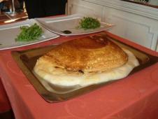テーブルについて注文した時に、入り口のほうから”シャカシャカシャカ”とリズミカルな音が聞こえてきた。レストラン入り口から見えるオープンキッチンのテーブルで、大きな銅のボールにたっぷり卵を泡立てて中。ふんわり泡立てられた卵は、長ーい柄のフライパンに注ぎ込まれ、大きな薪の釜戸で一枚一枚焼かれていた。オムレツが有名と聞いていたが、どうせ機械で作っているのだろうと思っていたのだが、一個一個手作りで、泡立ても手作業だったので驚いた!お料理は、伝統のオムレツが食べられるランチコースにした。「ラ・メール・プラール」伝統のオムレツ(2人分)大きい!!お皿に盛り付けられた”伝統のオムレツ”塩味のスフレのような感じで、一度食べてみる価値はあるかもしれない。