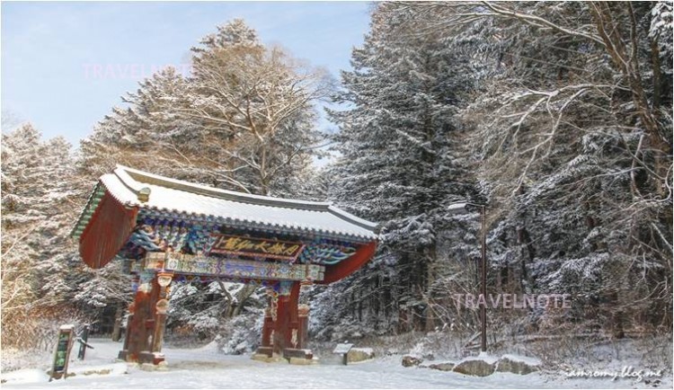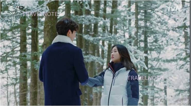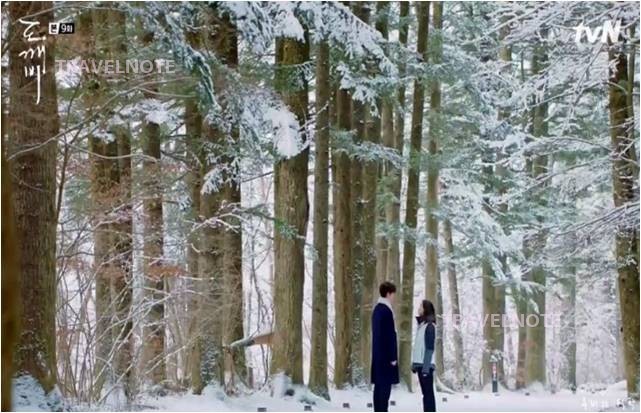 キム・シンがウンタクに愛の告白をした場所。月精寺のイルジュ門から金剛橋まで約940mの道に、平均樹齢80年を超えるモミの木1,800本余りが生い茂り、「千年の並木道」とも呼ばれています。静謐で神秘的な雰囲気を演出しています。冬は雪がモミの木の枝に積もり、より一層風情ある光景を見る事が出来ます。