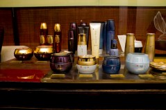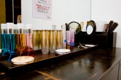 トリートメントが終わったら、メイクコーナーでBBクリームなどを塗布します。 「ハンユル(韓律)」の化粧品が並んでいますので、自由に使ってくださいね! |