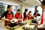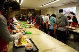 一枚一枚に薬味を詰めたら、綺麗に白菜をまとめます。この作業が、結構難しく、先生とマンツーマンで教えてもらます。 |