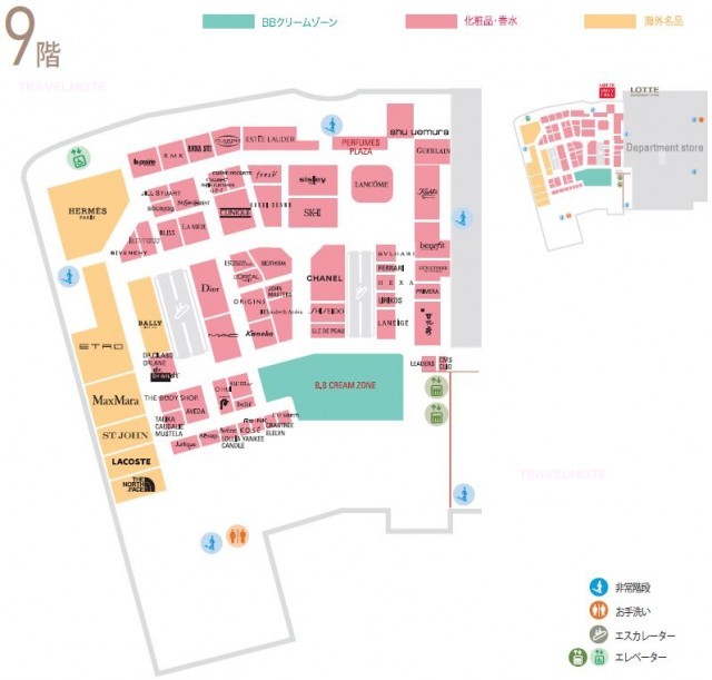 【9階】 9階フロアのほとんどは化粧品売り場で占めています。ディオールやシャネル、ランコムなどの海外有名コスメブランドからthe saem、su:m37、O HUIなど韓国人気コスメブランドまで約70ものブランドが勢揃い!いろんなブランドが集まった香水コーナーやBBクリームコーナーなどもあります。また、化粧品売り場の横には、エルメスなどの海外ブランドブティックなども並んでいます。 |